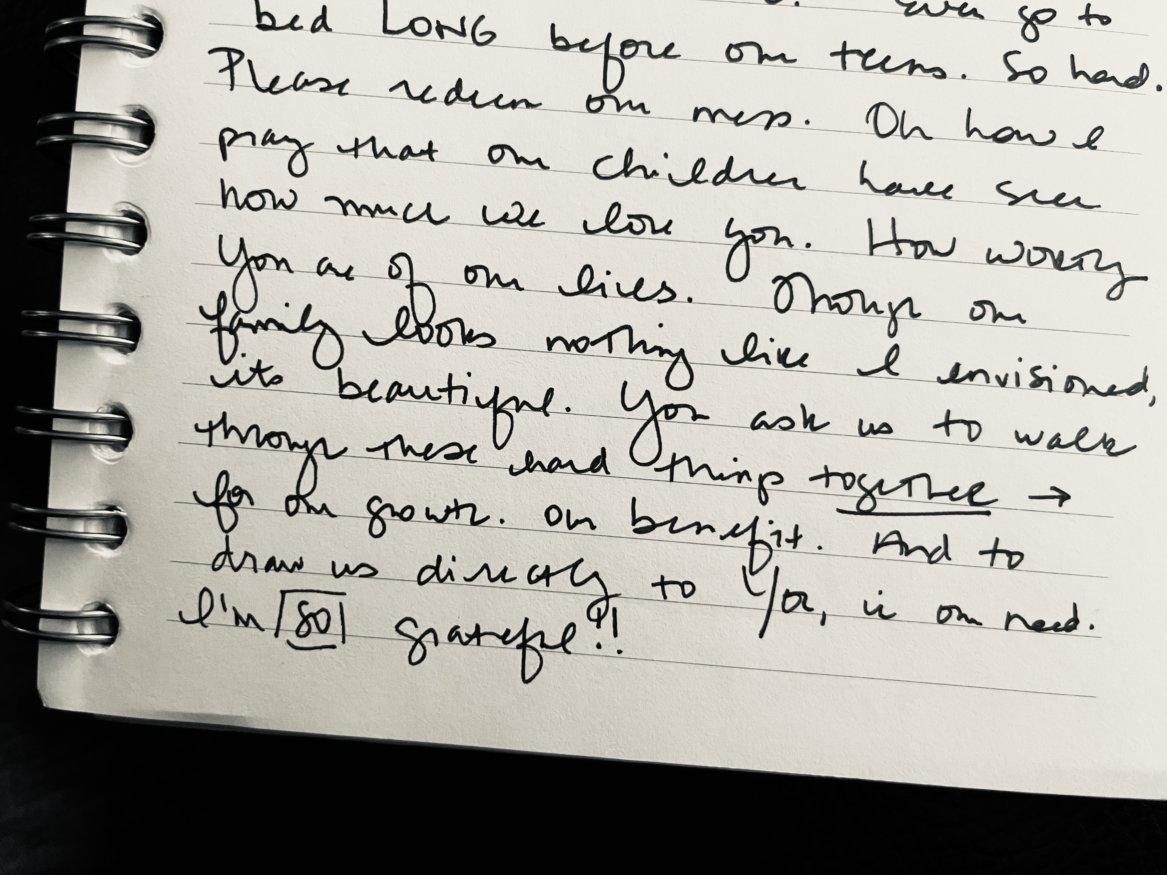 Lord, I feel so wholly inadequate some days. And like a total failure. Seems to be so many more ‘downs’ than ‘ups’ as we journey. We’ve had to let go of so many things out of sheer exhaustion and survival. Please redeem our mess. Oh, how I pray that our children have seen how much we love You. How worthy You are of our lives. Though our family looks nothing like I envisioned, it’s beautiful. You ask us to walk through these hard things together . . . for our growth. Our benefit. And to draw us directly to You, in our need. I’m SO grateful.”